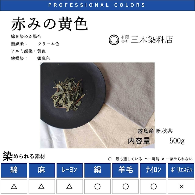 【霧島の自然を、暮らしに纏う】 霧島の厳しい冬を前に、太陽の光を極限まで蓄えた『晩秋茶』。 その茶葉には、春の芽にはない濃厚なカテキンが宿っています。 飲むだけではもったいない。霧島のエネルギーが凝縮された色を、あなたのお家で体感してください。 植物染料は、 市販の衣類に使われる化学染料に比べ、色あせや変色がしやすい性質があります。 しかし、月日とともに色が馴染み、移ろっていく。その「生きている色」の美しさこそが、天然染料の醍醐味です。 また、染めなおしをして自分色に色を成長させてください。 = 特徴 = 綿を染めた場合。 赤みの黄色:アルミ媒染剤 アルミ媒染で引き出す、温かみのある赤みの黄色。 銀鼠(ぎんねず): 鉄媒染剤 鉄媒染で変化する、霧島を包む霧のような深いグレー。 = 染められる素材 = 絹(シルク)・羊毛(ウール): 非常によく染まり、光沢のある発色が楽しめます。 綿・麻・レーヨン: 染まりづらいため、濃染処理(下処理)をおすすめします。 = 色見本について(必ずご確認ください) = 掲載している写真は、「綿素材」をアルミ媒染、鉄媒染処理したものです。 染める素材(絹、綿など)によって、色の入り方は大きく異なります。 一般的に絹はより濃く鮮やかに、綿は素朴で柔らかな色合いになります。 水質や季節、煮出し時間などの些細な条件で、色は一期一会の変化を見せます。 「あなただけの霧島の色」との出会いをお楽しみください。 = 内容量と目安 = 500g(お店推奨・標準) 染まる量の目安: 染める素材の重さと「同量」の茶葉を使うと、最も濃厚な色になります。 #kirisimatya