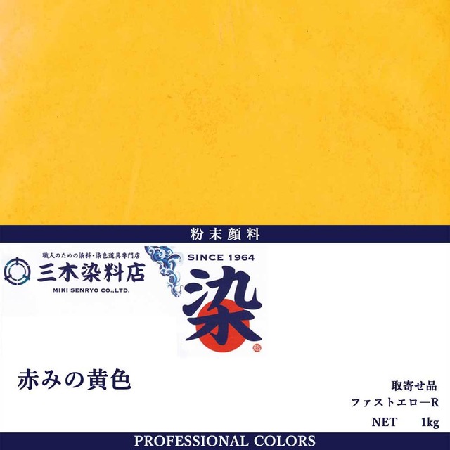 - 赤みの黄色|ファストエロ―R - 紅型の業界で使用されている粉末顔料です。 単体では、着色できません。 バィンダー(定着剤)と混合して各種の布(綿・麻・ポリエステルなど)を、着色します。 蒸しや水洗が不要で着色できます。 - 内容量 - 500g入り - 性 状 - 粉末 - 特 徴 - ・ 紅型の制作に使用していただいております。 ・ 乳鉢で顔料の粒子を細かくすると、鮮やか(白っぽく)になります。 ・ 顔料は水には溶けません。 定着剤に均一に混ざるように、混ぜないといけないです。 難し作業になります。 - 定着剤 - ネオバィンダー#41(定着剤)と混ぜて使用します。 豆汁(定着剤)と混ぜて使用します - 保 管 - 湿気の少ない換気できる場所で保存してください。 ※ ※ ※ 絵具、蝋の着色剤の用途としても使用できます。 繊維以外の用途は、弊社も専門外のため明確なアドバイスできません。 予め、ご了承ください。 #fastyellowR