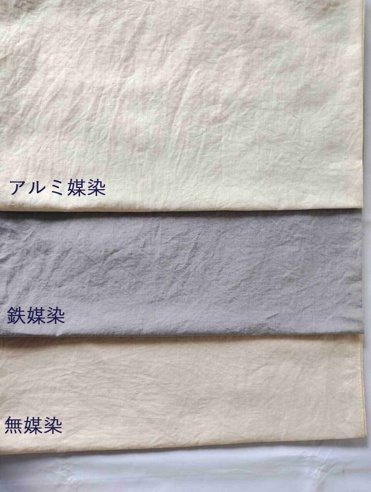 掲載している写真は、「綿素材」をアルミ媒染、鉄媒染処理したものです。