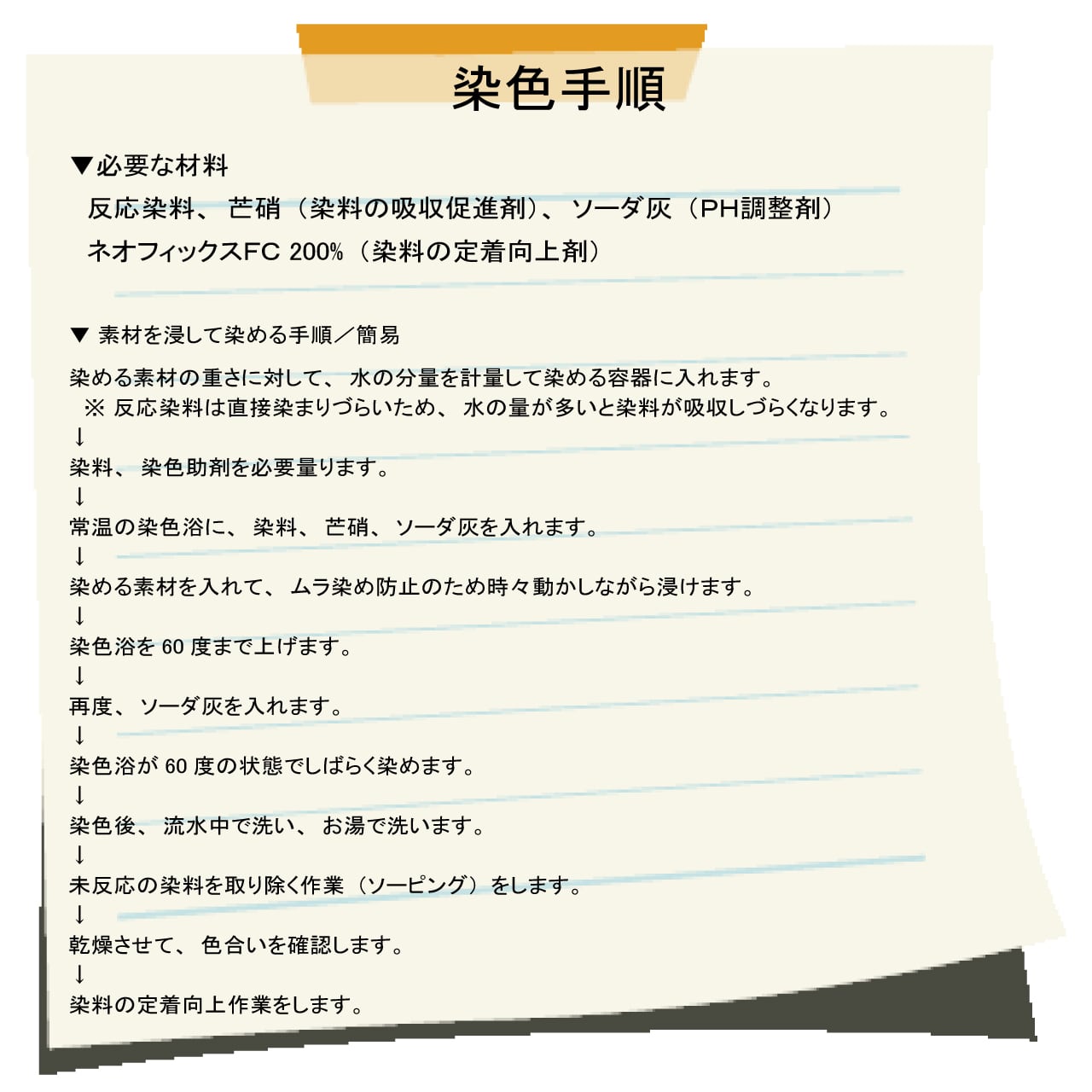 反応染料の場合は、工程が煩雑でかつ多岐にあるため詳細な染色手順は、直接お問い合わせください。